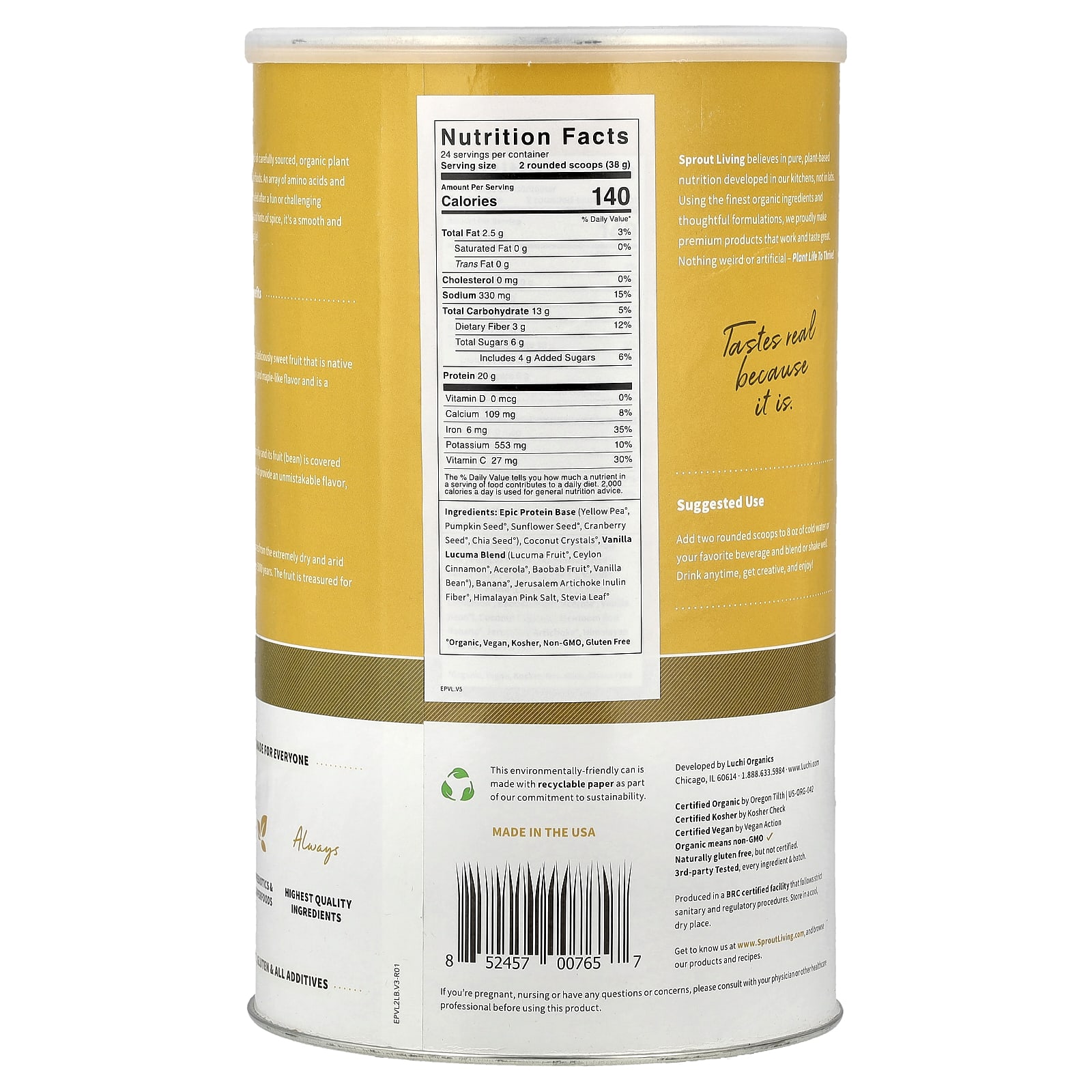 Sprout Living Epic Protein® Proteína Vegetal Orgânica + Superalimentos Lúcuma de Baunilha 912 g (2 lb)