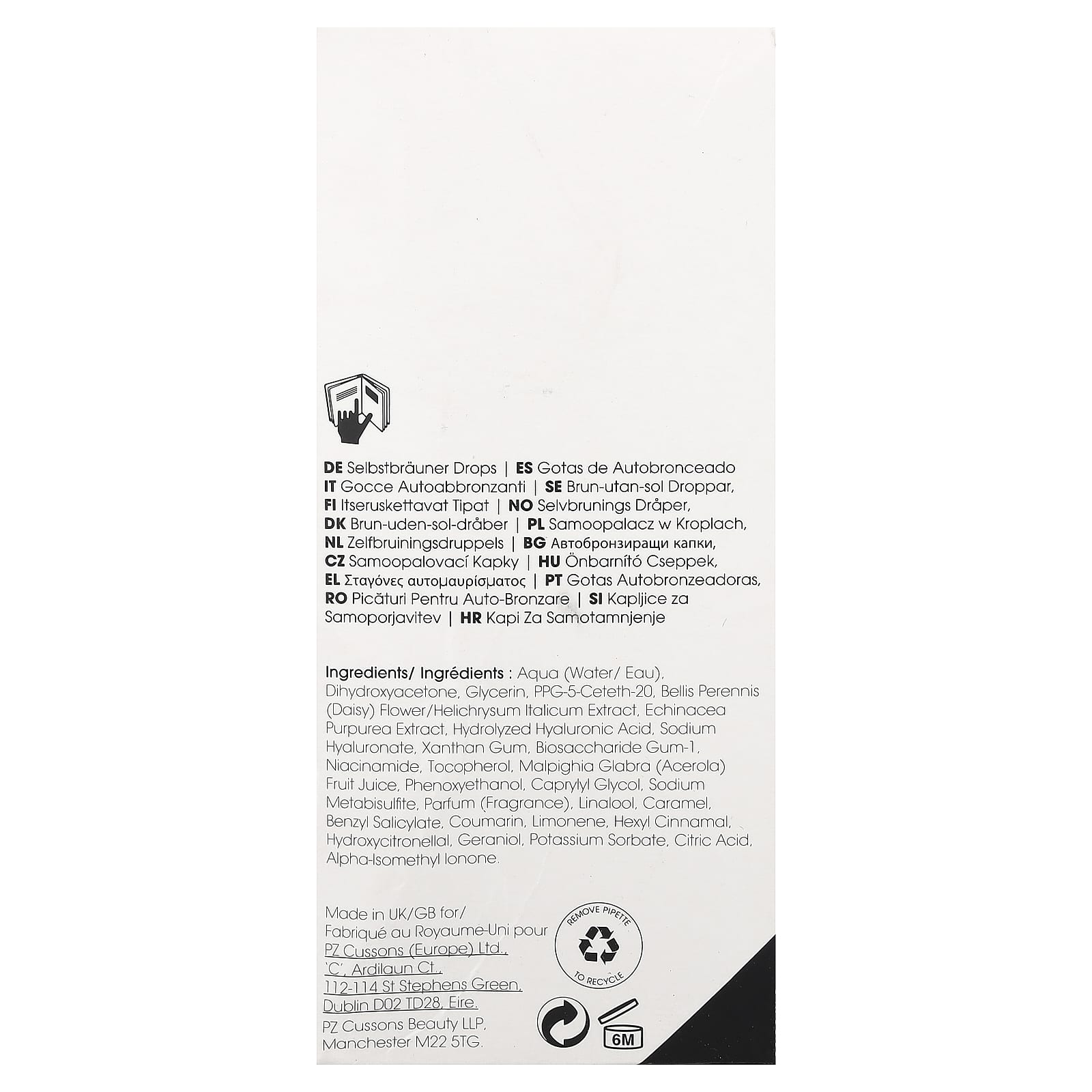aqua (água/eau), di-hidroxiacetona, glicerina, ppg-5-ceteth-20, flor de Bellis perennis (margarida)/extrato de Helichrysum italicum, extrato de Echinacea purpurea, ácido hialurônico hidrolisado, hialuronato de sódio, goma xantana, goma de biossacarídeo-1, nicotinamida, tocoferol, suco da fruta de Malpighia glabra (acerola), fenoxietanol, caprylyl glycol, metabissulfito de sódio, perfume (fragrância), linalol, caramelo, benzyl salicylate, cumarina, limoneno, hexyl cinnamal, hydroxycitronellal, geraniol, sorbato de potássio, ácido cítrico, alpha-isomethyl ionone.