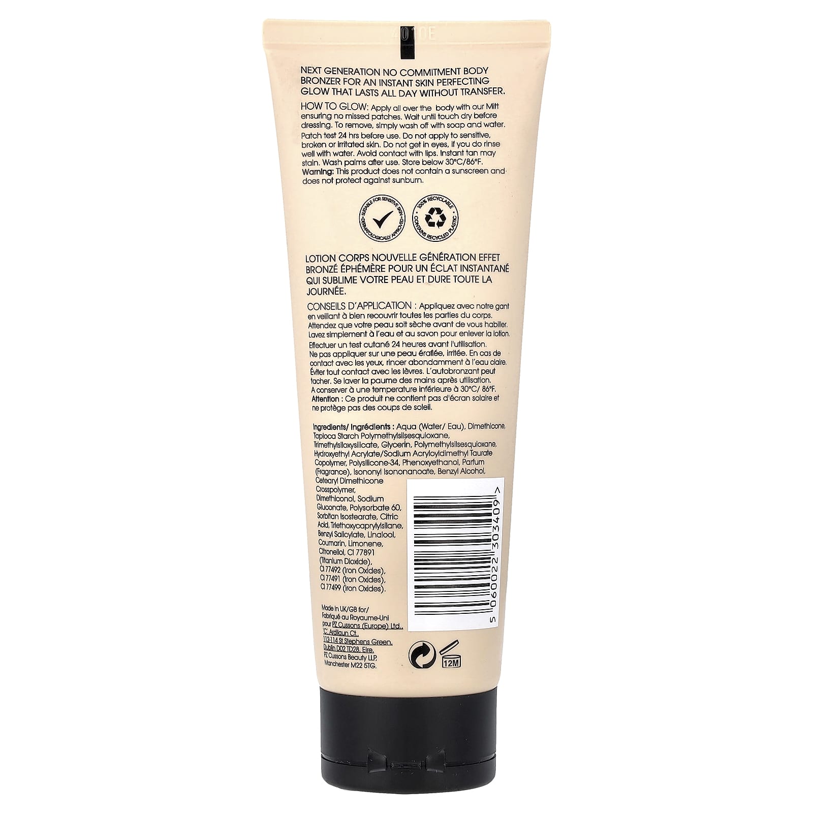 Faça o teste epicutâneo 24 horas antes do uso. Não aplique em pele sensível, ferida ou irritada. Não deixe o produto entrar em contato com os olhos. Se fizer isso, enxágue com bastante água. Evite contato com os lábios. O bronzeado instantâneo pode manchar. Lave as palmas das mãos após o uso. Armazene abaixo de 30 °C/86 °F.
