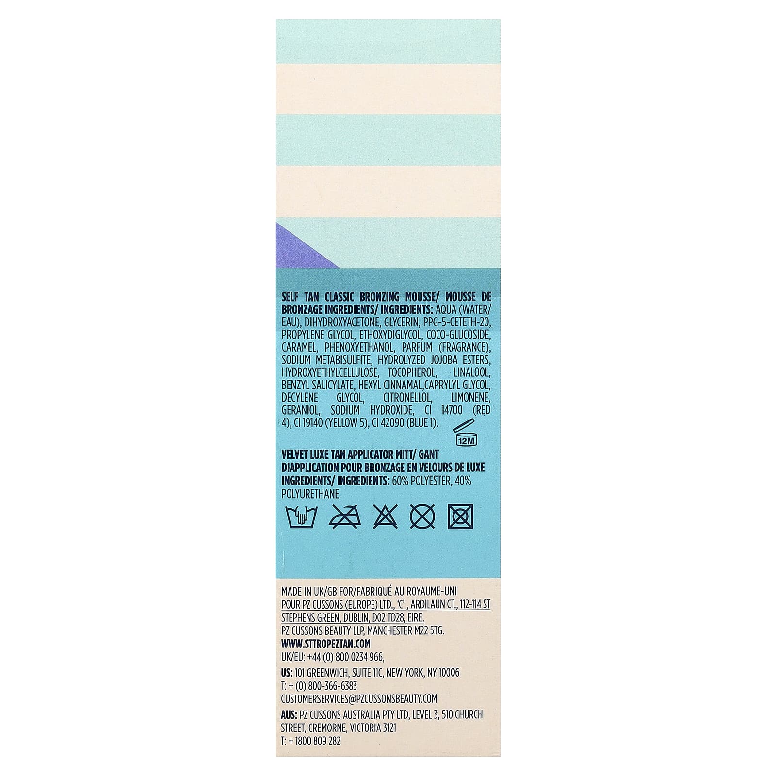 Mousse Bronzear Clássica para o Autobronzeador: Água, di-hidroxiacetona, glicerina, ppg-5-ceteth-20, propilenoglicol, éter dietilenoglicol monoetílico, coco-glucoside, caramelo, fenoxietanol, perfume (fragrância), metabissulfito de sódio, ésteres de jojoba hidrolisados, hietelose, tocoferol, linalol, benzyl salicylate, hexil cinamal, caprylyl glycol, decylene glycol, citronelol, limoneno, geraniol, hidróxido de sódio, CI 14700 (vermelho 4), CI 19140 (amarelo de tartrazina), CI 42090 (azul 1).