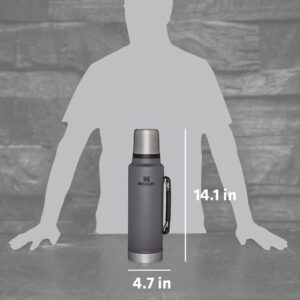Stanley Classic Vacuum Insulated Wide Mouth Bottle – Charcoal – BPA-Free 18/8 Stainless Steel Thermos for Cold & Hot Beverages – 1.5 QT – KEEP IT HOT OR COLD: Our Stanley Classic Vacuum Bottle is made with superior insulation that keeps liquids (soup, coffee, tea) hot or cold drinks cool for up to 24 hours. Its also made with BPA-free materials, keeping its contents safe to consume – TOUGH AND DURABLE The industrial-grade 18/8 stainless steel construction on this insulated thermos means it can work just as hard as you do without impacting its performance. This is an ideal bottle to throw into your truck, work bag, or travel with it – MULTI-PURPOSE LID: The Stanley thermos is designed with a leak-resistant lid, so you can put it in your backpack without worrying about any spills. The wide mouth of the thermos helps with easy pouring into the lid that doubles as an eight-ounce cup – FILL IT FOR THE DAY Our vacuum bottle comes in multiple sizes 1.1qt, 1.5qt, and 2qt so you can fill it up once and be set for however long you need it. The collapsible handle makes it easy to transport with you – LIFETIME WARRANTY: BUILT FOR LIFE. Since 1913 weve promised to provide rugged, capable gear for food and drink, built to last a lifetime. Its a promise we still keep. Stanley products purchased from Stanley Resellers come with a lifetime warranty