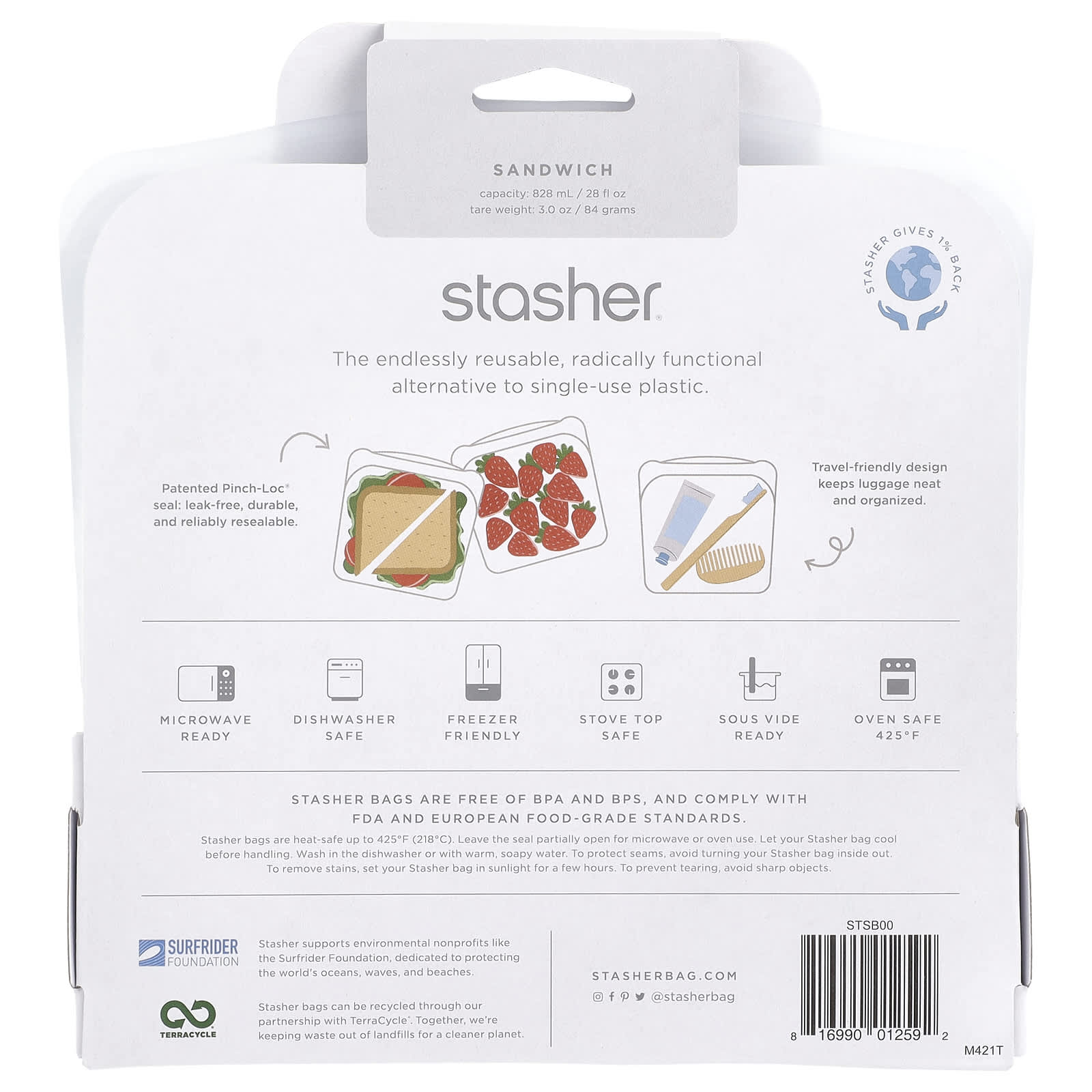 Os sacos Stasher não contêm BPA e BPS e estão em conformidade com a FDA e os Padrões Europeus de Classe Alimentar.