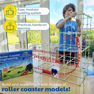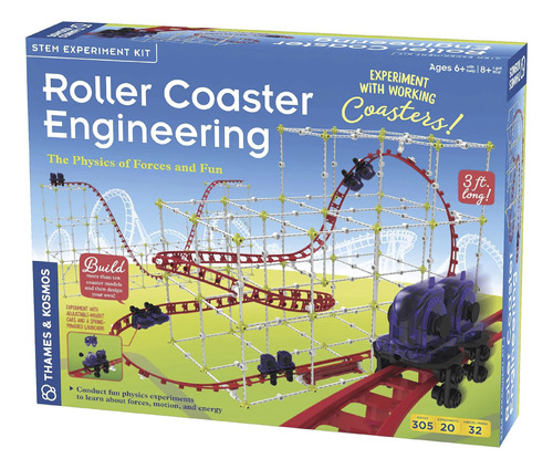Thames & Kosmos Roller Coaster Engineering STEM Kit Design, Build, Experiment w/ Working Roller Coaster Models Explore Physics, Forces, Motion, Energy, Velocity & More Solve Building Challenges – Design and build your own working roller coaster models. – Conduct fun, hands-on physics experiments to learn about force, motion, energy, and more. – Complete challenges that require you to build roller coasters of all shapes and sizes. – The plastic building system is durable, easy-to-assemble, and reusable. – The 32-page, full-color manual guides building and experimentation with step-by-step assembly instructions and scientific explanations.