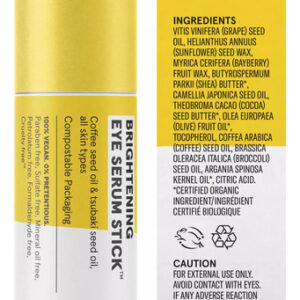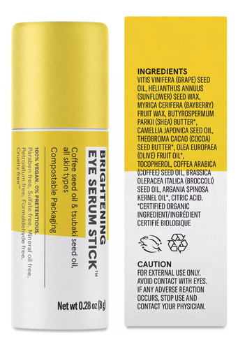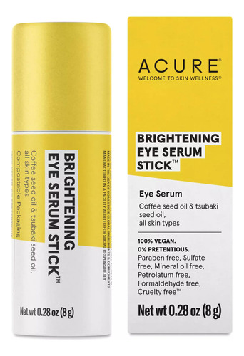 Stick Acure Brightening Eye Serum, sérum para os olhos, óleo de semente de café e óleo de semente de Tsubaki, para todos os tipos de pele, 0,28 onças — Este sérum para os olhos sem água passa de sólido a sérum em contato com óleo de semente de brócolis rico em antioxidantes, óleo de semente de tsubaki e óleo de semente de café. A embalagem interna é compostável em casa quando vazia.