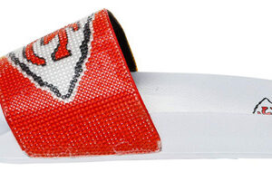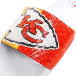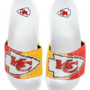 Slide de strass feminino FOCO Kansas City Chiefs NFL com logotipo grande – M – Licenciado oficialmente – Design colorido da equipe com logotipo da equipe exibido na alça – Strass transparentes na parte superior da alça – Logotipo da equipe em miniatura exibido no calcanhar da palmilha – Estilo slip-on com design aberto