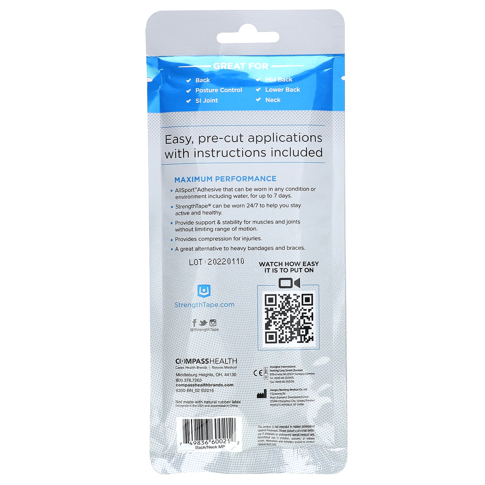- StrengthTape® pode ser usado 24 horas por dia, 7 dias por semana para ajudá-lo a se manter ativo e saudável.