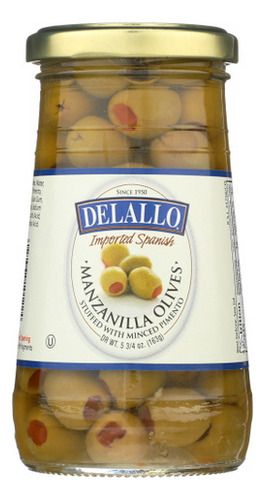 As azeitonas Manzanilla recheadas Delallo são azeitonas espanholas verdes e carnudas com um sabor azedo e salgado, recheadas com pimentão vermelho doce. Como aperitivo, cobertura de salada ou azeitona martini, a manzanilla recheada tem uma presença elegante na mesa. Azeitonas verdes espanholas grandes e carnudas. Recheadas com pasta de pimentão docemente aromática. Saboroso contraste de azeitona salgada, azeitona azeda e azeitona doce, super saborosa e divertida com apelo gourmet.