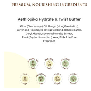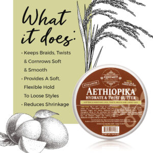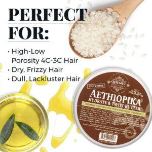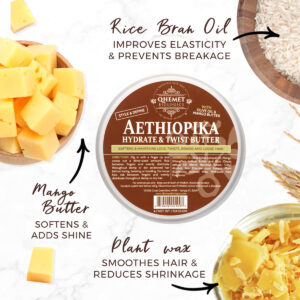 Nossa manteiga de cabelo semimacia suaviza cabelos espessos e secos com uma mistura ultra-rica de azeite puro, manteiga de manga e óleo de farelo de arroz. Um toque de cera vegetal ajuda a reduzir o frizz e suavizar as bordas, e o extrato de soja fornece umectância. Esta manteiga hidratante para cabelo é perfeita para cabelos africanos naturais, pois fornece a quantidade certa de umidade e retenção sem rigidez e descamação. Use para travas, tranças, torções e torções. Divida o cabelo em seções manejáveis e aplique uma pequena quantidade de manteiga de cabelo Aethiopika em cada seção. Para estilos soltos suaves e definidos, trance, torça ou trance o cabelo e mantenha-o por várias horas ou durante a noite e depois desenrole. Para maior suavidade e brilho, aplique nosso sérum suavizante de rícino e moringa na ponta dos dedos enquanto se desenrola. Separe e afofe até obter a plenitude desejada. – Segure para cabelos de alta e baixa porosidade – Esta manteiga hidratante é perfeita para cabelos africanos naturais e cabelos de alta e baixa porosidade, pois fornece a quantidade certa de umidade e segura sem rigidez e descamação. – Adiciona definição flexível – Essa manteiga modeladora rica e hidratante adiciona uma definição macia e flexível aos seus cabelos, torções, tranças e estilos soltos. Um toque de cera vegetal ajuda a reduzir o frizz e suavizar as bordas. – Suaviza cabelos espessos e secos – Esta manteiga semimacia suaviza cabelos grossos e secos com uma mistura ultrarrica de azeite de oliva puro, manteiga de manga e óleo de farelo de arroz. – Excelente para estilos soltos – Para estilos soltos, trance, torça ou aperte o cabelo e mantenha a manteiga Aethiopika Hydrate & Twist por várias horas ou durante a noite e depois desenrole. – Sem óleos minerais, proteínas, silicones, corantes ou parabenos.