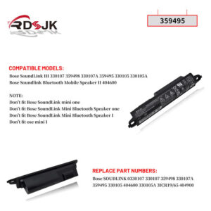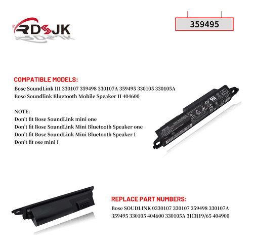 Tipo de bateria: íon de lítio; tensão: 11,1 V; capacidade: 2230 mAh/25 Wh; cor: preto Modelos de máquina compatíveis: Bose SoundLink III 330107 359498 330107A 359495 330105 330105A alto-falante móvel Bluetooth Bose Soundlink II 404600 NOTA: Não serve para o mini alto-falante Bluetooth Bose SoundLink Alto-falante Bluetooth Bose SoundLink Mini I Não serve para o Bose mini I Números de peça compatíveis: Bose SOUNDLINK 0330107 330107 359498 330107A 359495 330105 404600 330105A Nota: Verifique se esta bateria é compatível com seu computador antes de comprar. Se você não tiver certeza disso, entre em contato conosco! – Tipo de bateria: íon de lítio; tensão: 11,1 V; capacidade: 2230 mAh/25 Wh – Modelos compatíveis: alto-falante Bluetooth Bose Soundlink III 330105 330107 359498 330105A 330107A 359495, alto-falante móvel Bluetooth Bose Soundlink II série 404600, alto-falante Bluetooth Bose Soundlink 2, alto-falante Bluetooth Soundlink 3, Soundlink II, SoundTouch 20 – Substitua a peça Números: Bose SOUDLINK 0330107 330107 359498 330107A 359495 0330105 330105 404600 330105A 3ICR19/65 404800 404900 414255 – 100% novo do fabricante. Até 500 ciclos de recarga durante a vida útil da bateria. O tempo real de operação dependerá da quantidade de eletricidade necessária para o dispositivo e de como você o usa – Para o primeiro uso, descarregue a bateria até 5% (não 0%) e depois carregue até 95% e rode 3-4 vezes.