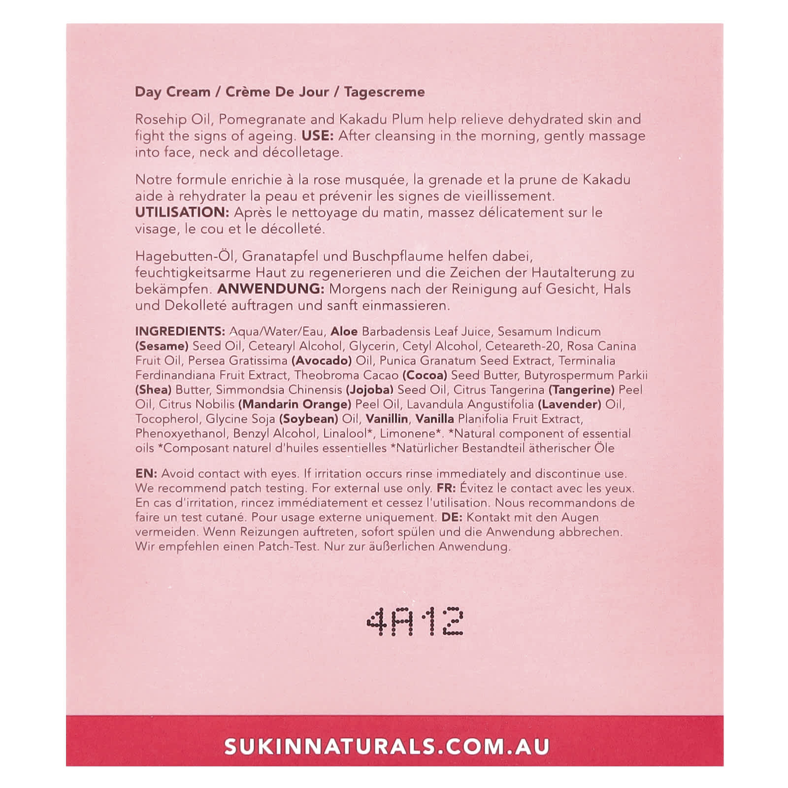 Água/aqua/eau, suco da folha de Aloe barbadensis, óleo de semente de Sesamum indicum (gergelim), álcool cetoestearílico, glicerina, álcool cetílico, ceteareth-20, óleo da fruta de Rosa canina, óleo de Persea gratissima (abacate), extrato da semente de Punica granatum, extrato da fruta de Terminalia ferdinandiana, manteiga da semente de Theobroma cacao (cacau), manteiga de Butyrospermum parkii (karité), óleo da semente de Simmondsia chinensis (jojoba), óleo da casca de Citrus tangerina (tangerina), óleo da casca de Citrus nobilis (mandarina), óleo de Lavandula angustifolia (lavanda), tocoferol, óleo de Glycine soja (soja), vanilina, extrato da fruta de Vanilla planifolia, fenoxietanol, álcool benzílico, linalool*, limoneno*.