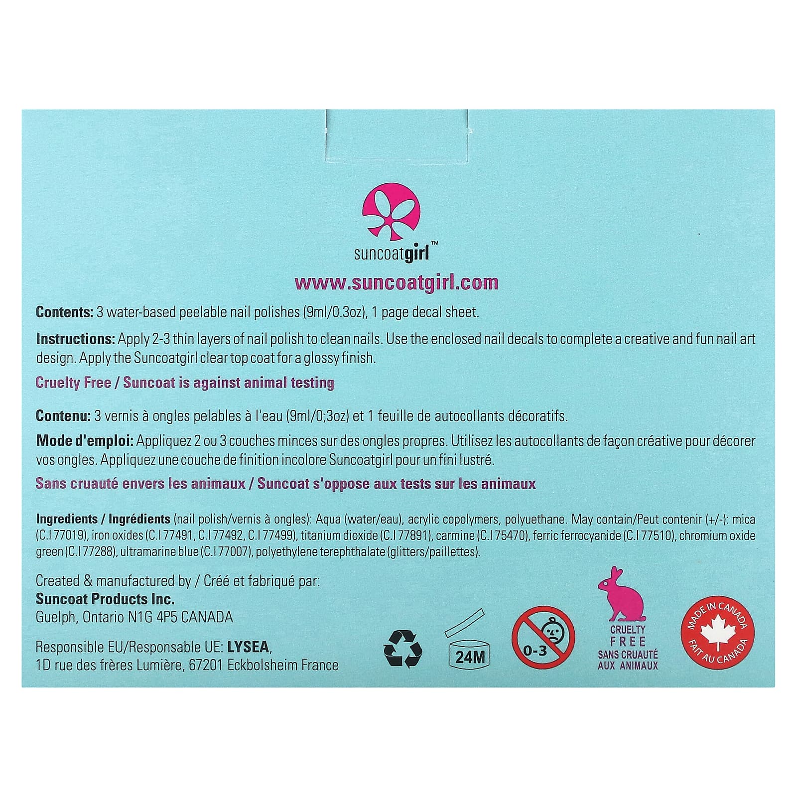 Conteúdo: 3 esmaltes de unha peláveis à base de água (9 ml / 0,3 oz), folha de decalque de 1 página.