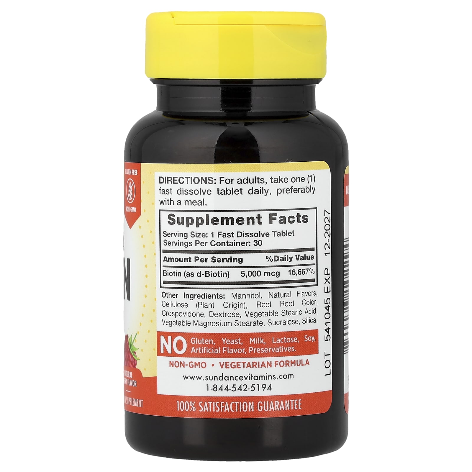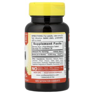 Sundance Vitamins Ultra-Biotina de Dissolução Rápida Baga Natural 5.000 mcg 30 Comprimidos de Dissolução Rápida – Sundance Suplementos Cabelos, Pele e Unhas Vitamina B7 (Biotina).