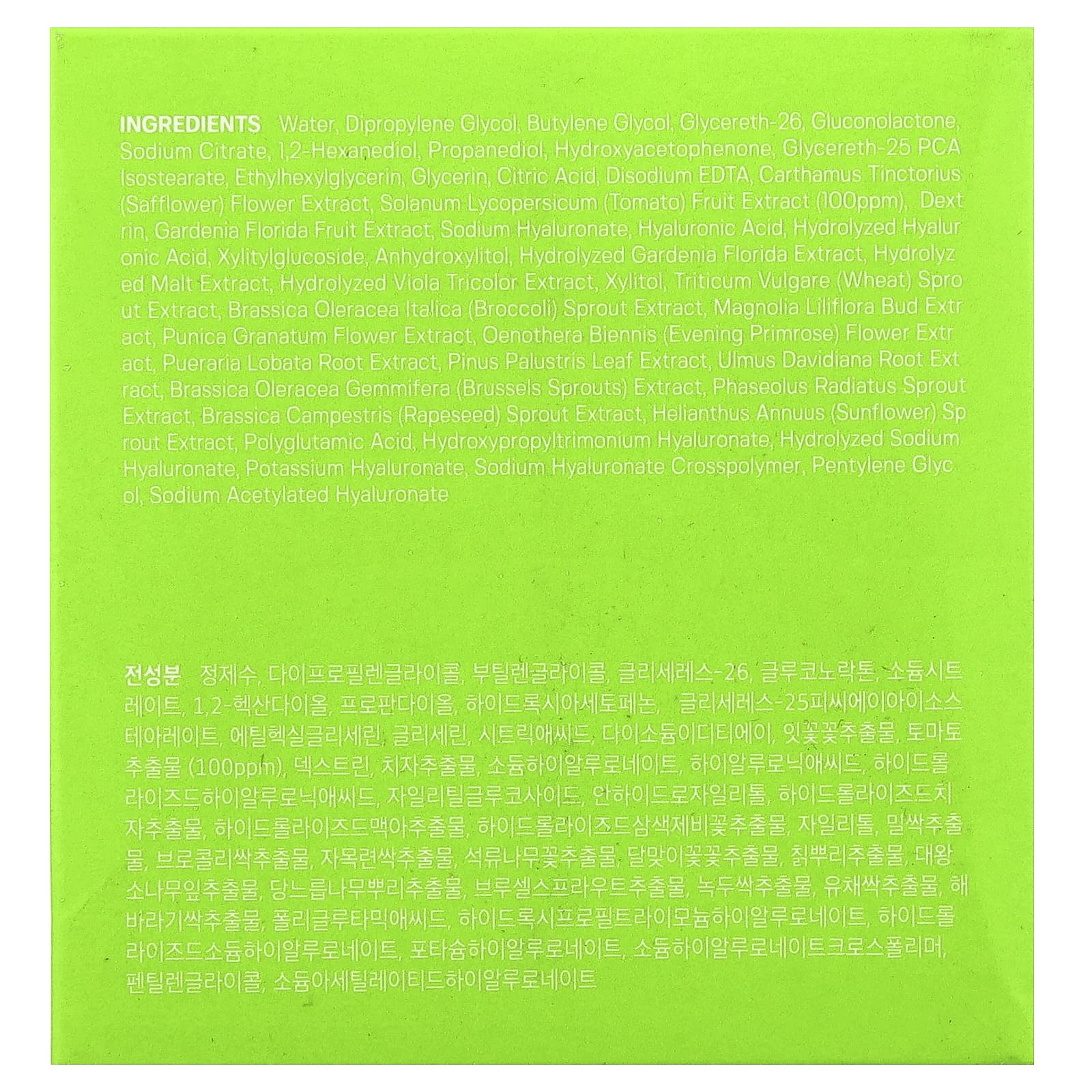 Água, dimetildietilenoglicol, butilenoglicol, glycereth-26, gluconolactone, citrato de sódio, 1,2-hexanediol, propanediol, hydroxyacetophenone, isostearato de glicerila-25 pca, ethylhexylglycerin, glicerina, ácido cítrico, edetato dissódico, extrato da flor de Carthamus tinctorius (cártamo), extrato da fruta de Solanum lycopersicum (tomate) (100 ppm), dextrina, extrato da fruta de Gardenia florida, hialuronato de sódio, ácido hialurônico, ácido hialurônico hidrolisado, xylitylglucoside, anhydroxylitol, extrato de Gardenia florida hidrolisado, extrato de malte hidrolisado, extrato de Viola tricolor hidrolisado, xilitol, extrato do broto de Triticum vulgare (trigo), extrato de esteróis de Brassica oleracea italica (brócolis), extrato do botão de Magnolia liliflora, extrato da flor de Punica granatum, extrato da flor de Oenothera biennis (prímula), extrato da raiz de Pueraria lobata, extrato da folha de Pinus palustris, extrato da raiz de Ulmus davidiana, extrato de Brassica oleracea gemmifera (couve-de-bruxelas), extrato do broto de Phaseolus radiatus, extrato de esteróis de Brassica campestris (colza), extrato do broto de Helianthus annuus (girassol), ácido poliglutâmico, hydroxypropyltrimonium hyaluronate, hialuronato de sódio hidrolisado, hialuronato de potássio, sodium hyaluronate crosspolymer, pentilenoglicol, sodium acetylated hyaluronate.