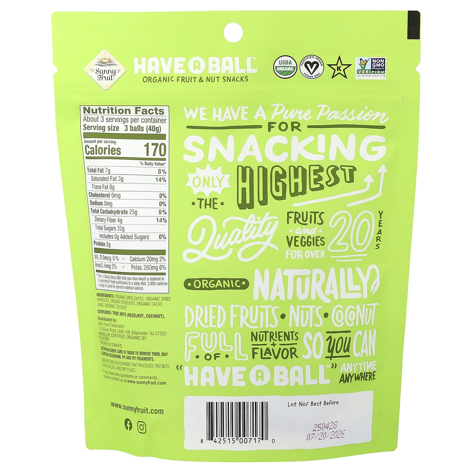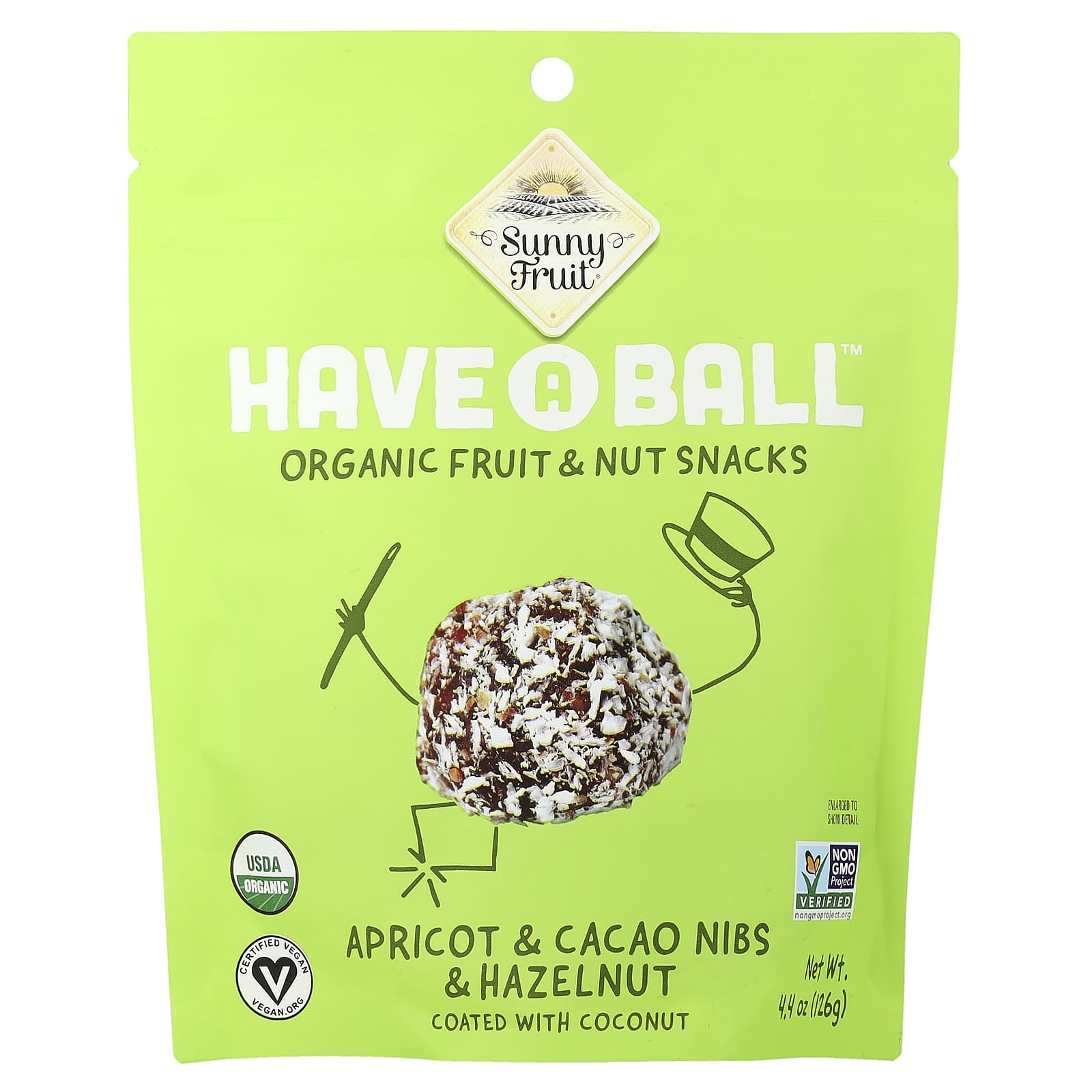 Sunny Fruit Eat A Ball™ Petiscos de Frutas e Nozes Orgânicas Damasco Gotas de Cacau e Avelã 126 g (44 oz) – Sunny Fruit Alimentos Petiscos e lanches Snacks de frutas e vegetais.