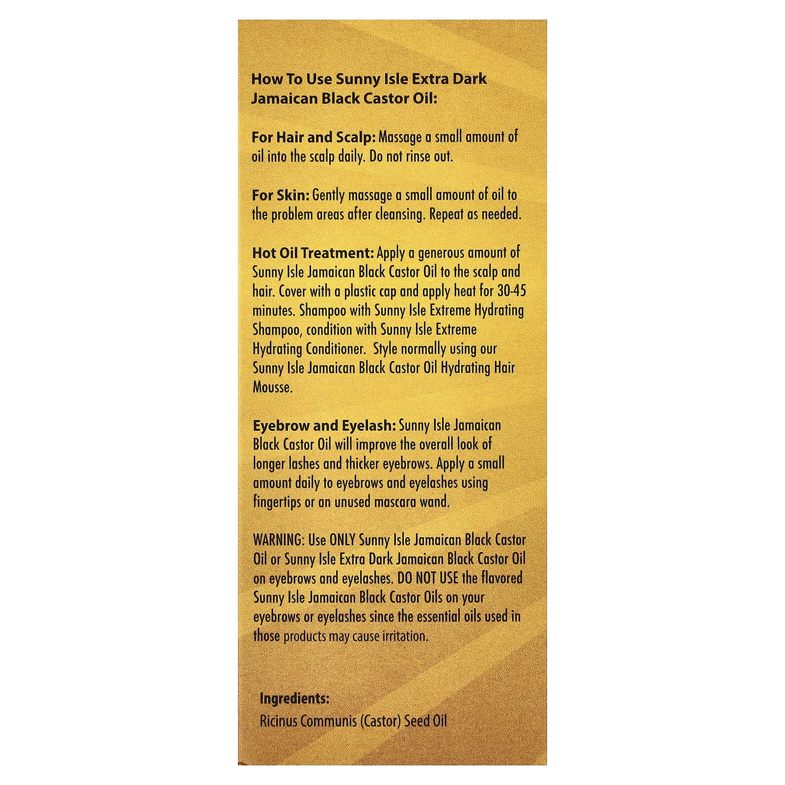 Use apenas Óleo de Rícino Preto Jamaicano Sunny Isle ou Óleo de Rícino Preto Jamaicano Extra-Escuro da Sunny Isle nas sobrancelhas e nos cílios. Não use os Óleos de Rícino Preto Jamaicanos com sabor da Sunny Isle nas sobrancelhas ou nos cílios, pois os óleos essenciais usados nesses produtos podem causar irritação.