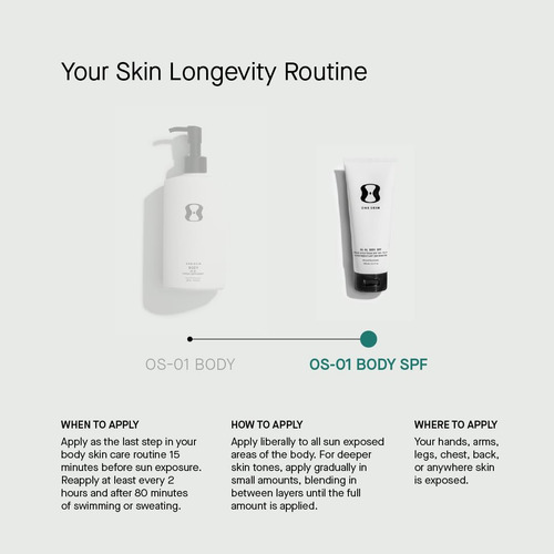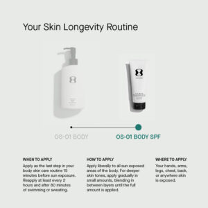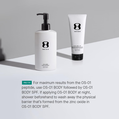 Alimentado por nosso peptídeo OS-01 exclusivo, além de óxido de zinco não nano e uma mistura de antioxidantes potentes, o OS-01 BODY SPF combate o envelhecimento da pele no nível celular, evita a perda de colágeno e protege contra danos UV. – Reduz os efeitos do envelhecimento por UV. (02) – Fornece poder antioxidante superior em comparação com outros SPFs antienvelhecimento contendo antioxidantes (03) – Protege a pele da degradação do colágeno induzida por UV. (04) – Formulado com óxido de zinco não nano para proteção UV de amplo espectro que é segura para seu corpo e vida marinha. – Formulado com o peptídeo OS-01 para visam o envelhecimento da pele no nível celular e promovem a longevidade geral da pele. (05)