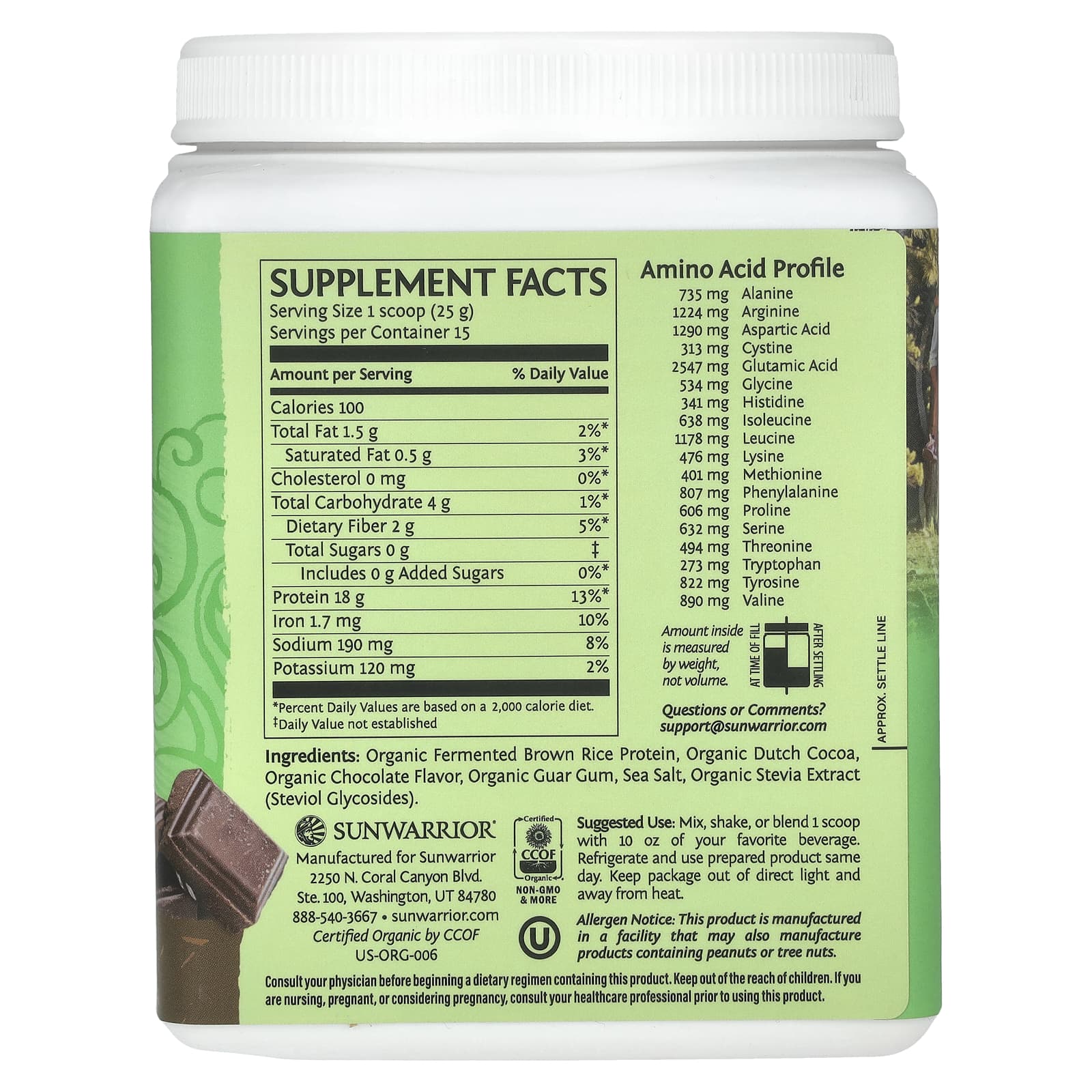 Proteína de arroz integral fermentado orgânico, cacau holandês orgânico, sabor de chocolate orgânico, goma guar orgânica, sal marinho, extrato de estévia orgânica (glicosídeos de esteviol).