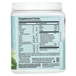 Sabor orgânico, leite de coco em pó orgânico, óleo TCM em pó orgânico (triglicerídeos de cadeia média orgânicos, goma arábica orgânica), goma guar orgânica, extrato da folha de estévia orgânica (glicosídeos de esteviol), sal marinho.