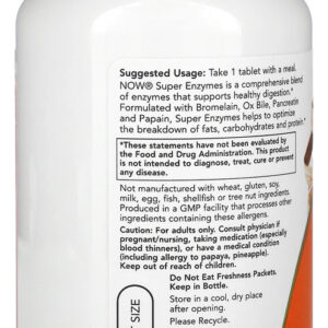 Now Foods Super Enzymes Enzimas Digestivas 90 Tablets / Importado   A Super Enzymes da Now Foods é uma mistura abrangente de enzimas digestivas que apoiam uma digestão positiva. Apresenta uma fórmula com compostos como bromelaína, pancreatina, papaína, dentre outras substâncias que auxiliam na  quebra de gorduras, carboidratos e proteínas e facilitam sua absorção de pelo organismo a partir do intestino, o que por sua vez, possibilita um melhor usufruto dos nutrientes ingeridos. Apenas um tablet por dia junto a uma refeição e você desfrutará de todos os benefícios da Super Enzymes.   Outros ingredientes:   celulose, sílica, ácido esteárico (fonte vegetal), estearato de magnésio (fonte vegetal), croscarmelose sódica e esmalte farmacêutico. Contém sulfitos.   Fabricado sem trigo, glúten, soja, leite, ovo, peixe, marisco ou ingredientes de nozes.    Recomendações de uso: Tome 1 Tablet ou comprimido com uma refeição.   Cuidados: Apenas para adultos. Busque orientação antes de utilizar este produto se estiver grávida ou amamentando. Mantenha fora do alcance de crianças.   Armazenamento: Armazenar em local seco e fresco após a abertura.   Conteúdo do frasco: 1x Frasco com 90 Tablets   Acompanha 1 Porta Cápsulas, Validade Longa.