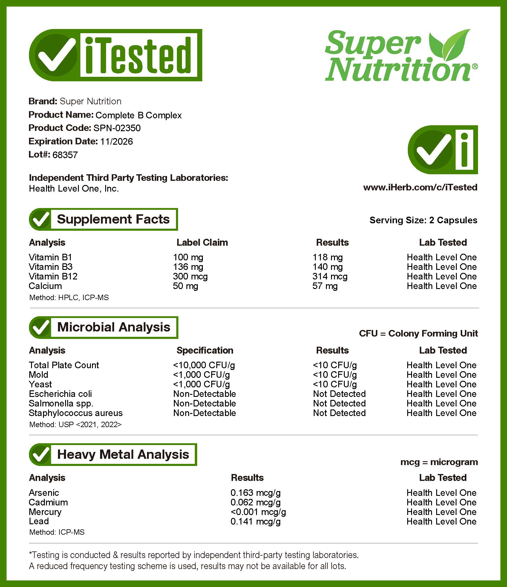 Tiamina (como cloridrato de tiamina), Riboflavina (como riboflavina e fosfato sódico de riboflavina), Ácido nicotínico (como nicotinamida e ácido nicotínico), Vitamina B6 (como cloridrato de piridoxina e fosfato de piridoxal), Folato (como L-methylfolate de cálcio), Vitamina B12 (como mecobalamina), Biotina (como d-biotina), Ácido Pantotênico (como pantotenato de cálcio), Cálcio (como pantotenato de cálcio e fosfato de cálcio dibásico), Inositol, PABA (ácido para-aminobenzoico).