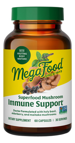 Suporte imunológico de cogumelos de superalimento Este suplemento de cogumelos formulado por médicos contém manjericão sagrado, uma erva adaptogênica que apoia o sistema imunológico e o bem-estar geral. Cada porção oferece 45 mg de beta glucanos de cogumelos maitake, bem como 300 mg de sabugueiro. Esta fórmula é feita com 100% de extratos corporais frutíferos de cogumelos Maitake obtidos através da extração de água quente até os níveis de beta glucana. Os cogumelos são cultivados em estufas em substratos naturais com condições ambientais de ar fresco, temperatura ambiente e umidade que se alinham às rigorosas.