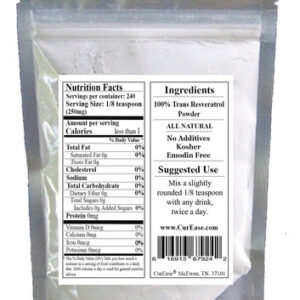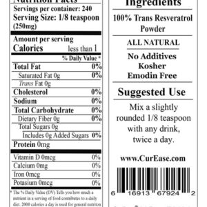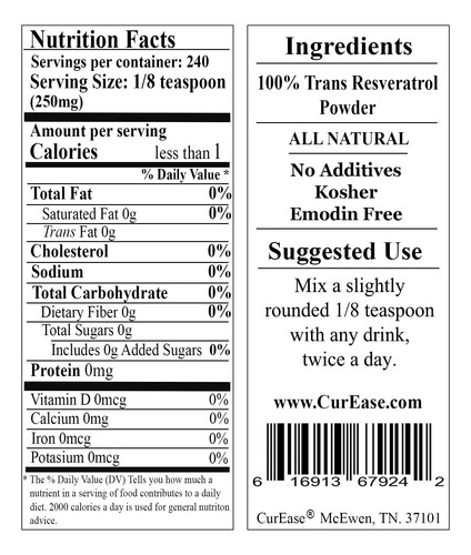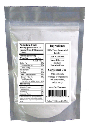 O pó de resveratrol trans 99,5% puro da CureAse é o resveratrol trans mais poderoso disponível com um valor/pontuação Orac de 31.000 por grama e 1.860.000 por pacote! Livre de emodinas! Sem aditivos Sem enchimentos Sem agentes fluidos. Suprimento de 4 meses. 240 porções. 250 mg por porção. 60 g/2,1 oz. Uso sugerido: 1/8 colher de chá duas vezes ao dia. Garantimos que o conteúdo deste produto seja tão puro e preciso quanto o anunciado.