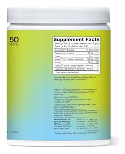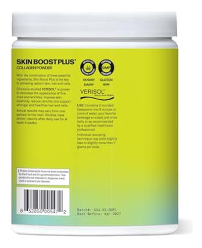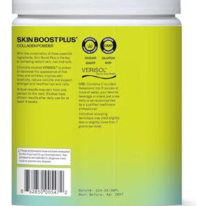 Cada porção de Sparkle Wellness Skin Boost Plus contém 5.000 mg de peptídeos bioativos de colágeno VERISOL, 100 mg de vitamina C e 100 mg de ácido hialurônico ingredientes clinicamente comprovados para melhorar a saúde da pele. Este suplemento aumenta os níveis de colágeno na pele em até 60%, promovendo uma superfície cutânea mais uniforme e uma redução visível das linhas finas ao redor dos olhos. Enriquecido com ácido hialurônico e vitamina C, ajuda a aumentar a síntese de colágeno e a manter a hidratação da pele por mais tempo. Também ajuda a fortalecer o cabelo e as unhas, aumentando a espessura e o crescimento do cabelo, além de melhorar o crescimento das unhas e reduzir os sintomas de unhas quebradiças.
