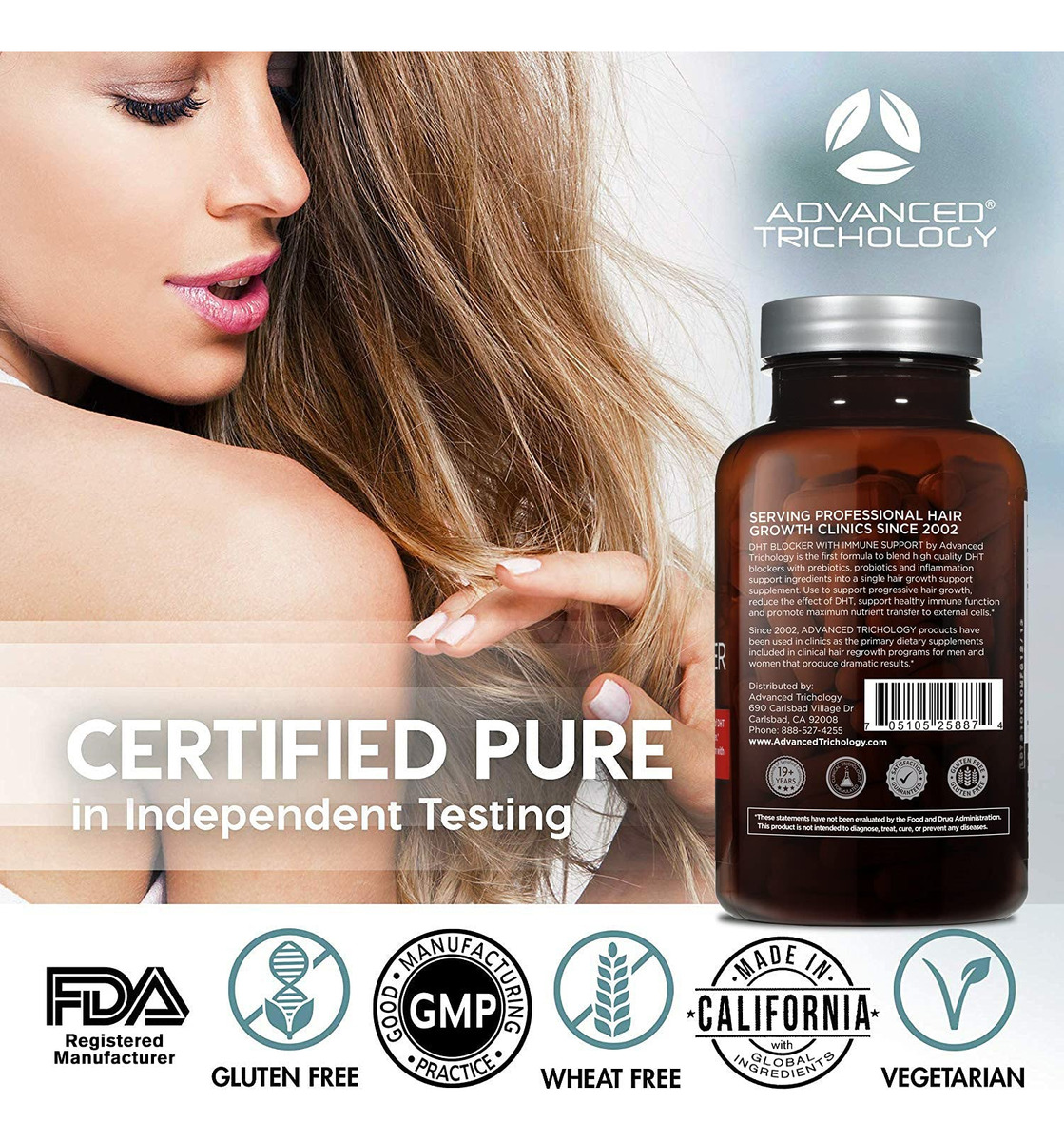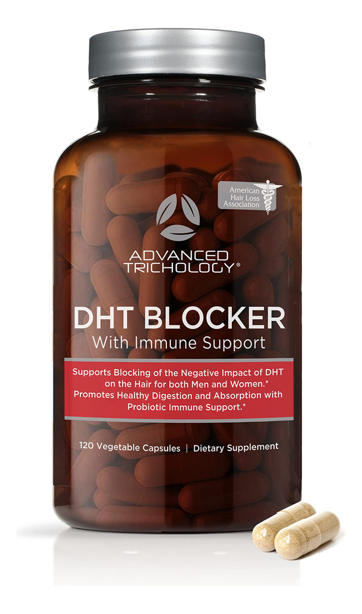 O bloqueador de DHT com suporte imunológico é a primeira fórmula a combinar nutrientes de qualidade redutores de DHT com suplementos prebióticos, probióticos, antiinflamatórios e antimicrobianos. Usado para crescimento progressivo do cabelo, suporte imunológico e máxima transferência de nutrientes para células externas. O bloqueador de DHT Advanced Trichology com suporte imunológico equilibra os sistemas internos, prevenindo a inflamação que causa a queda de cabelo. Este suplemento foi formulado por tricologistas certificados e especialistas do Evolution Hair Loss Institute.