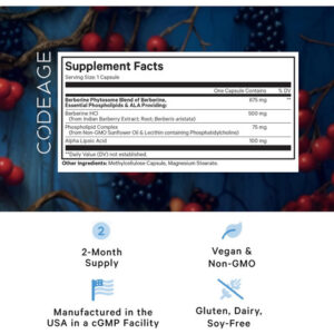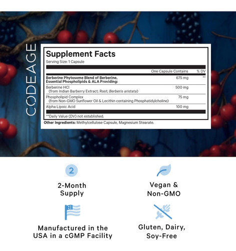 • Premium berberina HCL: O suplemento de berberina de codeage apresenta Berberina HCl de alta qualidade derivada do extrato indiano de Barberry (Berberis Aristata), fornecendo 500 mg de berberina por porção.