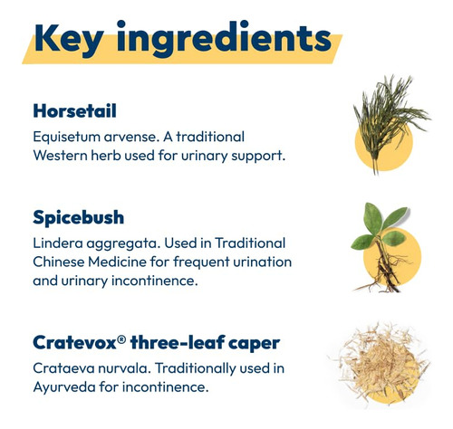 Apoia a função saudável da bexiga para ajudar a reduzir a urgência urinária, a frequência e acidentes ou vazamentos ocasionais associados ao envelhecimento normal. Promove uma frequência urinária saudável, importante para noites mais tranquilas e dias despreocupados. Formulado com uma mistura cientificamente testada de ingredientes à base de plantas, este suplemento diário ajuda a reduzir a urgência urinária, a frequência e acidentes ou vazamentos ocasionais associados ao envelhecimento normal, fornecendo suporte 24 horas. Desfrute de menos idas ao banheiro para ter um sono mais ininterrupto, viaje com confiança e continue se sentindo confortável sabendo que está no controle da função da bexiga – Ajuda a reduzir a urgência e a frequência urinária com suporte 24 horas associado ao envelhecimento normal – Diminui acidentes ocasionais e vazamentos associados ao envelhecimento normal – Fique tranquilo, com suporte diurno e noturno – Menos vazamentos ajudam a reduzir o uso ocasional de almofadas – Desfrute de mais viagens e aventuras sem preocupações