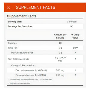1 g concentrado de aceite de pescado, 1 g grasa total, 1 g grasa poli-insaturada, 500 mg ácido docosahexaenoico (DHA), 250 mg ácido eicosapentaenoico (EPA) |