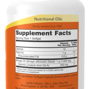 10 kcal valor energetico, 1 g grasa total, 0. 6 g grasa poli-insaturada, 1 g aceite de borraja, 240 mg ácido gamma linolénico |