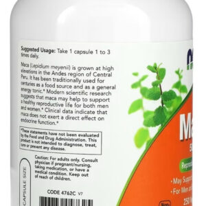 Maca Peruana 500mg Now Foods 250 cápsulas vegetais pode apoiar o bem-estar sexual para homens e mulheres. É tradicionalmente utilizada há séculos como fonte de alimento e tônico energético geral. Pode ajudar a manter uma vida reprodutiva saudável.