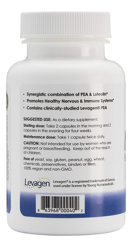 Reduza a dor e a inflamação naturalmente com a ação combinada da palmitoiletanolamida (PEA) e da luteolina.* Fornece suporte natural para todo o corpo, incluindo os sistemas nervoso, imunológico e digestivo.* A