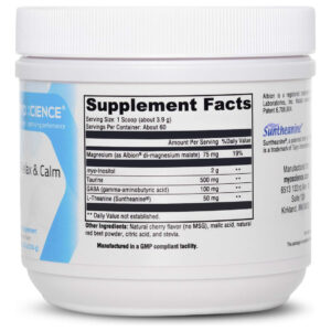Myo Relax and Calm contains a blend of ingredients that supports the bodys natural synthesis of catecholamines, the inhibitory neurotransmitter GABA, hormonal balance, and healthy glucose metabolism. The drink aims to promote a calm, relaxed, well-balanced emotional and physiological state. Indications: Sleep enhancement, Supports Relaxed Mood, Healthy glucose metabolism, Hormonal balance, calm neurological state – SUPPORT HEALTHY GLUCOSE METABOLISM*: myo-iIositol has been shown to support metabolic health in both women and men. Each scoop offers 2 grams. – RELAX YOUR MIND AND BODY: the nutrients L-Theanine and GABA support a relaxed mood* (Each scoop contains 50 mg and 100 mg of each, respectively) – ELECTROLYTES Taurine and Magnesium (as magnesium malate) are important nutrients involved in electrolyte balance. Every scoop contains 500 mg of Taurine and 75 mg of Magnesium malate. – Gluten Free and made from non-GMO Ingredients in a GMP compliant facility.