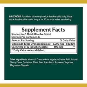 Tamanho: 80 comprimidos Esses exclusivos Quick Dissolve B-12 são uma maneira rápida e deliciosa de fornecer B-12 essencial quando você mais quiser. Basta colocar o comprimido de dissolução rápida debaixo da língua por 30 segundos antes de engolir. Você apreciará o busto de um excelente sabor natural de cereja e os benefícios da vitamina B-12! (1)