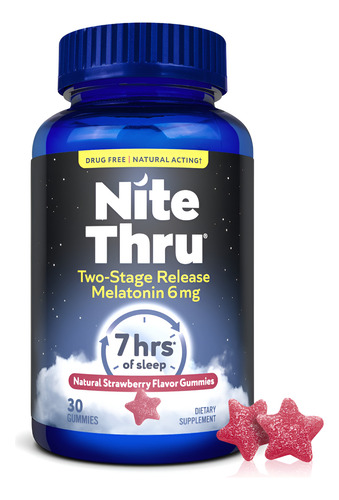 Melatonina de liberação em dois estágios Nite Thru, 6 mg, morango, suplemento dietético, 30 gomas