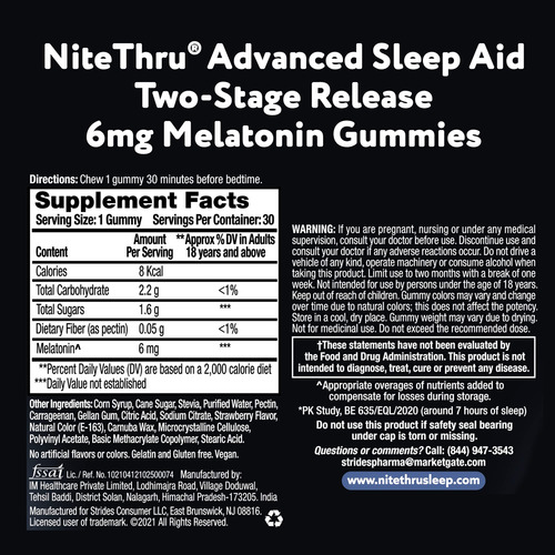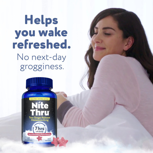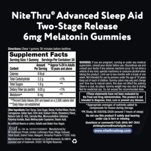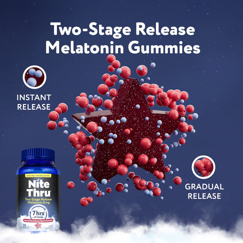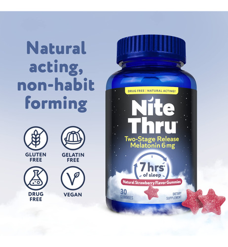GOMAS DE MELATONINA DE LIBERAÇÃO EM DOIS ESTÁGIOS: Agora você pode obter os mesmos benefícios de melatonina NiteThru para dormir em uma goma vegana com sabor natural de morango, formulada com 6 mg de melatonina que não cria hábitos. – Um sonífero de ação natural: as gomas de melatonina NiteThru