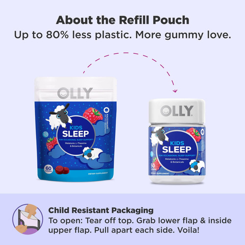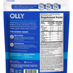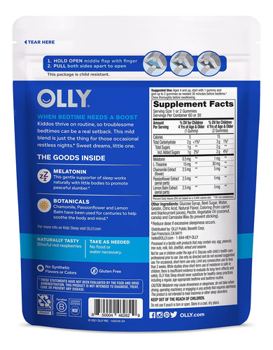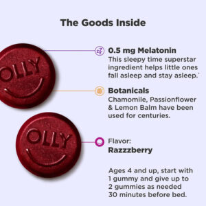Goma de dormir OLLY Kids, 0,5 mg de melatonina, L-teanina, camomila e erva-cidreira, suplemento para mastigar para crianças, suporte ocasional para dormir, framboesa — 60 unidades (a embalagem pode variar) — GOMAS OLLY KIDS SLEEP GUMMIES: as crianças prosperam na rotina, então a hora de dormir problemática pode ser um verdadeiro revés. Essa mistura suave para apoiar o sono é ideal para aquelas noites agitadas ocasionais. Sweet Dreams little one – THE GOODS INSIDE: As gomas de suplemento Kids Sleep fornecem uma mistura suave de melatonina (0,5 mg) para apoiar ciclos de sono saudáveis, incluindo L-teanina e uma mistura de ervas medicinais tradicionalmente usadas: extratos de camomila, maracujá e erva-cidreira – COMO TOMAR: A partir dos 4 anos, comece com 1 goma e dê até 2 gomas, conforme necessário, 30 minutos antes de dormir. Mastigue bem antes de engolir — DELICIOSAMENTE SABOROSAS: as gomas OLLY Sleep vêm no sabor de amora silvestre com outros sabores naturais, sem cores ou sabores sintéticos e não contêm glúten. Esses suplementos de apoio ao sono são uma deliciosa mistura de ingredientes sem medicamentos. 50 gomas por frasco – MISTURE E COMBINE: criamos produtos que são tão eficazes quanto deliciosos. Gomas para melhorar o bem-estar, pós, cápsulas gelatinosas premium e mais formas de se sentir feliz do avesso — FÁCEIS COMO 1, 2, ZZZ: quando as crianças precisam de um pouco de apoio para dormir, use os suplementos OLLY Sleep da ZZZ, porque a vida não vem com um botão de soneca. Suporte para dormir para ajudar crianças a partir de 4 anos a adormecerem – NOVAS NOTÍCIAS: melhoramos o sabor e a textura de nossos produtos com as mesmas delícias OLLY em cada goma