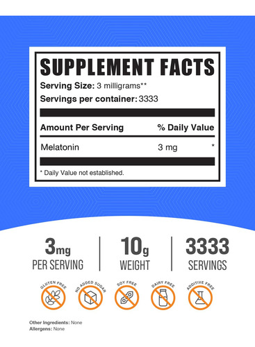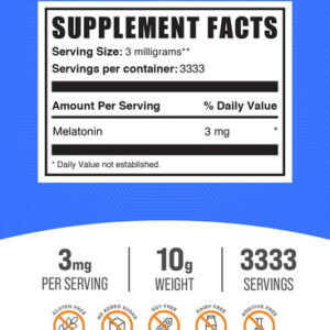 Em BulkSupplements.com, vendemos suplementos dietéticos que variam de aminoácidos e proteínas em pó a suplementos de ervas, vitaminas e minerais que podem ajudar na sua jornada de saúde e bem-estar. Encontre o complemento perfeito para sua rotina diária. Nossa ampla seleção oferece a liberdade de criar seu próprio regime de suplementos para suas metas de saúde. Oferecemos uma variedade de formulários para ajudá-lo a encontrar o que funciona para seu estilo de vida, escolha entre pó, cápsulas e cápsulas gelatinosas. Nossa ampla seleção de suplementos dietéticos é fabricada de acordo com os padrões cGMP para garantir a mais alta qualidade nas operações de fabricação, embalagem, rotulagem e retenção. Além disso, trabalhamos com um laboratório terceirizado que testa cada lote de nossos produtos em vários estágios durante a produção, da matéria-prima aos produtos acabados, para garantir conformidade, padrões e consistência. Com uma variedade de mais de 500 suplementos, temos algo para todos. Se você deseja manter a saúde ideal ou apenas quer ajuda para cruzar a linha de chegada, temos tudo o que você precisa. – Eleve sua saúde geral e bem-estar: feito sob medida para apoiar sua saúde geral, nosso suplemento de melatonina em pó, em 3 mg de melatonina, é o complemento perfeito para qualquer estilo de vida. Conhecidos como nutrientes essenciais para você, eles foram projetados para melhorar seu bem-estar geral, fazendo com que você se sinta melhor dia após dia. – Dosagem ideal para cada necessidade: se você está procurando uma rotina consistente na hora de dormir, nosso suplemento de melatonina, em melatonina, para adultos, vem na dosagem de 3 mg usando uma escala precisa de miligramas para atender às suas necessidades específicas, garantindo suporte personalizado à sua saúde do sono.* – Integração fácil com opções de estilo de vida: se você está para quem viaja pelo mundo, ou alguém que valoriza a simplicidade, nosso pó de melatonina, em 3 mg, serve facilmente em todos os estilos de vida. Fáceis de levar e convenientes de armazenar, eles garantem que seu caminho para um descanso melhor esteja sempre ao seu alcance. – Transparente e confiável: experimente a confiança de escolher um suplemento que não apenas atenda aos rigorosos testes de terceiros, mas também cumpra os princípios de clareza e integridade em sua formulação e produção. – Compromisso com a excelência: produzido em uma instalação compatível com os rígidos padrões cGMP, nosso suplemento de melatonina, em pó de 3 mg, permanece como prova da nossa dedicação à qualidade. Você pode confiar na consistência e excelência do nosso produto, lote após lote.