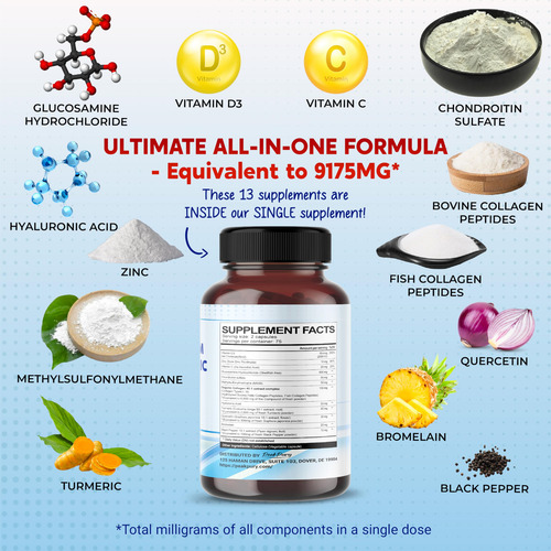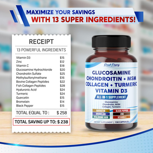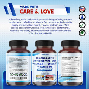 – Fusão ideal: a glucosamina PeakPury contém vitamina D3, zinco, vitamina C, glucosamina, condroitina, MSM, colágeno orgânico, ácido hialurônico, açafrão, quercetina, bromelaína e pimenta preta. – Suplemento de glucosamina de alta qualidade: sem transgênicos, soja, laticínios, glúten, recheio, conservante, sabor e sem nozes. Os ingredientes foram rigorosamente testados por laboratórios externos para garantir sua segurança, pureza e potência.