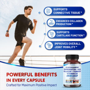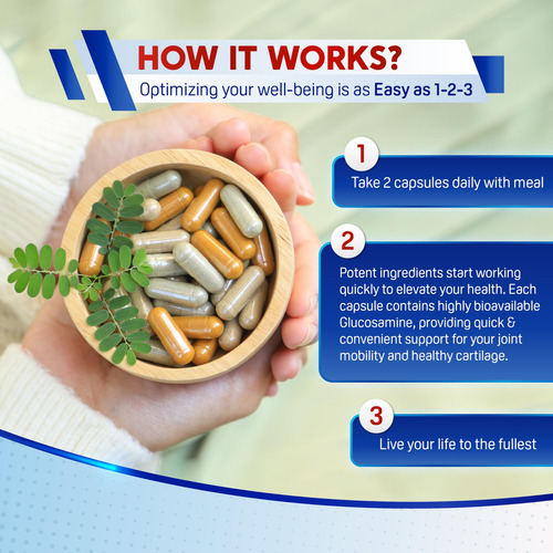 os ingredientes da glucosamina trabalham juntos para fortalecer o tecido conjuntivo, aumentar a produção de colágeno, promover a função da cartilagem e melhorar a mobilidade articular.