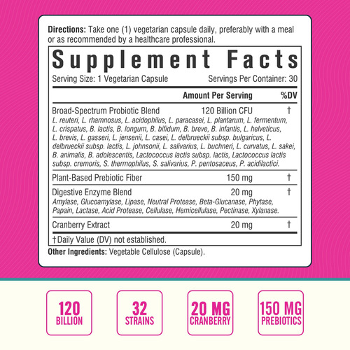 Probiotics + Prebiotics + Cranberry Extract + Digestive Enzymes – Advanced Combo NordVida Womens Probiotic contains probiotics, prebiotics, cranberry extract and digestive enzymes in just ONE easy-to-swallow capsule. To maximize probiotoics efficacy, weve included prebiotics to fuel the probiotics, keeping them alive and well, and cranberry extract for keeping urinary tract clean.* Plus 13 full-spectrum digestive enzymes for the break down of all major food types to aid digestion.* 120 Billion & 32 Strains- Gut & Vagina Booster* NordVida has carefully chosen 32 extensively researched strains with 120 billion to increase the health and diversity of your guts and vaginal flora, giving you a boost of overall health.* NordVida 120B Womens Probiotic May Help With: Balanced vaginal flora* Natural pH levels* Digestive health* Regular bowel movements* Strong immunity* Shelf Stable & Delayed Release Technology – Potency Guaranteed Our 32 carefully selected strains are double protected by shelf stable and delayed release technology so that their potency does not go down over time and more active cultures are delivered to your gut.* Our Probiotic is traveler friendly. You can take it on the go while enjoying probiotics benefits.* Proudly Made In The USA – Unparalleled Quality All NordVida supplements are proudly made in the USA in a GMP facility. Free Of Common Allergens – Vegan Friendly NordVida does not include gluten, dairy, soy, eggs, wheat, peanuts, tree nuts, shellfish or fish in the manufacturing of our products. We source from 100% Natural and Non-GMO ingredients without binders, fillers, artificial colors, flavors, or preservatives. – Probiotics + Prebiotics + Cranberry Extract + Digestive Enzymes: Our Womens Probiotic delivers 120 billion live cultures of 32 strains in one capsule. On top of that, we have combined these probiotics with prebiotics to nourish them.* Plus cranberry extract to boost urinary tract health and digestive enzymes to facilitate the digestion of food.* Harnessing the power of four ingredients, this unique formula offers broad-spectrum yet targeted support for womens overall health on the daily.* – Gut, Vagina & Urinary Tract Health*: Having too few beneficial cultures or too many harmful ones may disrupt the balance in your bodys systems.* High-diversity and high-potency strains taken together are able to restore a healthy and balanced microbiome, collectively keeping digestive system in check, enhancing abdominal comfort, supporting natural pH levels and vaginal health.* A-type proanthocyanidins found in cranberry may help cleanse your bladder for urinary tract health.* – Targeted Delivery, No Refrigeration Required: NordVida 120B Womens Probiotic is protected by targeted release technologies, which help probiotics survive harsh stomach acid and bile to reach your small intestine where they can exert maximum efficacy. Refrigeration is recommended but not required. You can enjoy all probiotics benefits while on the go. – Professional Grade, Unparalleled Quality: Doctors, researchers, and medical professionals in NordVida together have built a brand you can trust. We carefully formulate our products with 100% natural & Non-GMO ingredients and science-backed dosage in the USA in a GMP facility and meticulously test every bottle for purity, potency and consistency. – Plethora of Benefits, Risk Free: We have made this high potency product without gluten, dairy, soy, eggs, wheat, peanuts, tree nuts, shellfish, fish, artificial colors, flavors, or preservatives so that it can be enjoyed by all, no matter what your lifestyle is. If in any way you are not satisfied with this product, well refund you within a year of purchase.