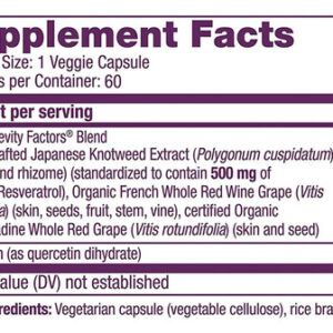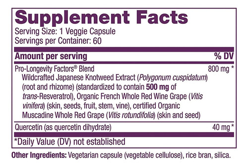 Nutrição Reserveage? s Resveratrol 500 mg oferece proteção antioxidante em nossa mistura patenteada que combina o melhor extrato selvagem de Knotweed japonês (Polygonum cuspidatum) (padronizado para 500 mg de resveratrol-trans) combinado com uvas orgânicas de vinho tinto francês e uvas Muscadine orgânicas, junto com quercetina para aumentar a bioatividade. Nosso premiado Pro-Longevity Factors Blend foi projetado para apoiar e ajudar a ativar o SIRT1? gene da longevidade? , fornecem rejuvenescimento celular e oferecem importante proteção antioxidante. Cada cápsula é padronizada para conter 500 mg de resveratrol-trans e está livre de enchimentos desnecessários.