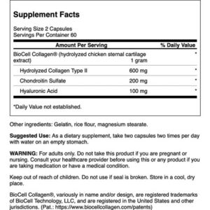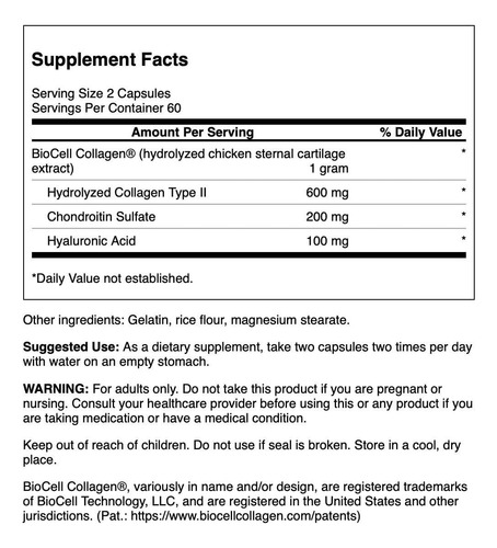 O colágeno Swanson Chicken Sternum promove um envelhecimento saudável, promovendo maior elasticidade da pele e reduzindo as rugas com o uso prolongado. Também promove maior facilidade de movimento ao nutrir o tecido conjuntivo para fortalecer e tornar as articulações mais flexíveis. Cada porção contém colágeno hidrolisado tipo II, sulfato de condroitina e ácido hialurônico do BioCell Collagen. O sulfato de