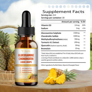 – Ajuda antiinflamatória: Nossas gotas de glucosamina e condroitina fornecem benefícios antiinflamatórios naturais e ajudam a reduzir a inflamação e a dor nas articulações. Essas propriedades os tornam ideais para quem sofre de desconforto, rigidez ou inflamação nas articulações devido ao uso diário ou mudanças relacionadas à idade. Incorporar essas gotas em sua rotina pode ajudar a aliviar a inflamação e melhorar o conforto das articulações.