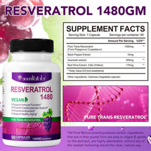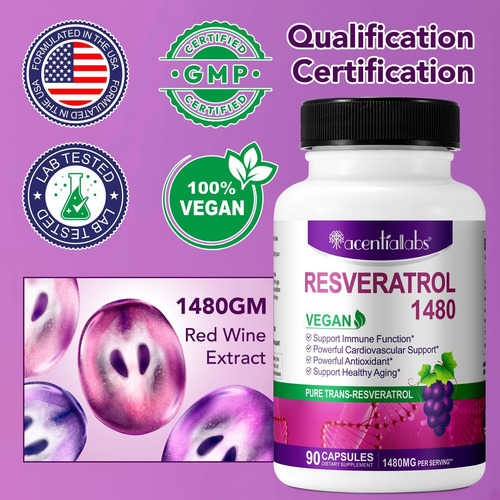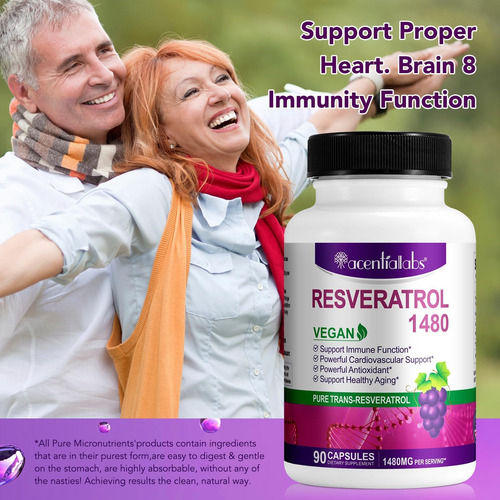 Eleve seu bem-estar com nossas cápsulas de resveratrol puro de 1000 mg. O resveratrol em sua forma trans permite uma estrutura mais estável, que aumenta a biodisponibilidade para uma absorção e utilização mais eficientes pelo corpo. – FORMULAÇÃO VEGANA – Suplementos autênticos de resveratrol não transgênicos. Contém ingredientes puros sem soja, laticínios, glúten, conservantes, trigo, peixe e nozes.