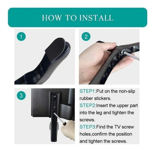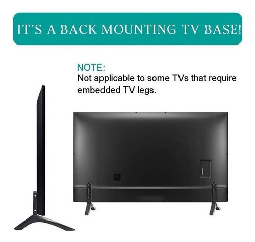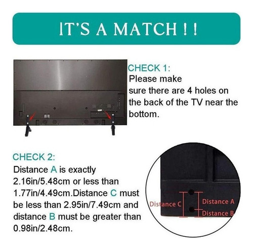2. Por favor, note que esta perna de TV não funciona com todas as TVs, então certifique-se de que tem 2 furos de montagem no lado esquerdo e direito da parte de trás da TV perto da parte inferior, e os furos de montagem de distância exatamente 2,16 polegadas/5,5 cm Ou menos de 1,77 pol./4,5 cm.