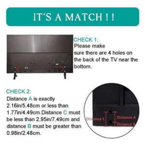 2. Entendendo que esta perna de TV não funciona com todas as TVs, portanto, certifique-se de que ela tenha 2 orifícios de montagem nos lados esquerdo e direito da parte traseira da TV perto da parte inferior, e os orifícios de montagem à distância exatamente 2,16 polegadas / 5,5 cm ou Menos de 1,77 pol./4,5 cm.