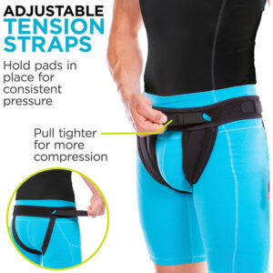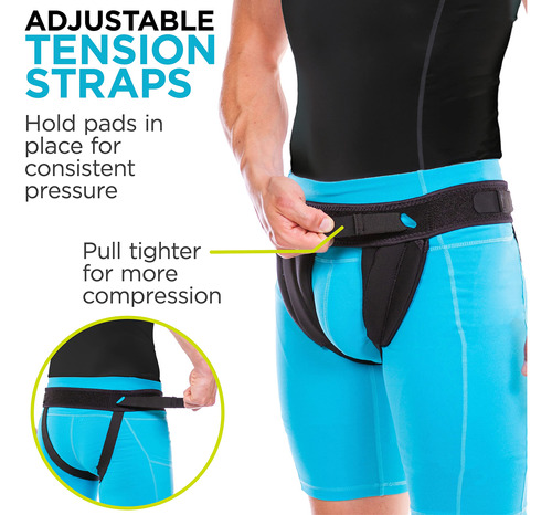 COMPRESSÃO AJUSTÁVEL — A treliça dupla de hérnia foi projetada com almofadas de compressão removíveis, fornecendo pressão constante e suave em um ou nos dois lados. Duas tiras elásticas de tensão garantem um ajuste personalizado sem o uso de fivelas e encaixes desconfortáveis.